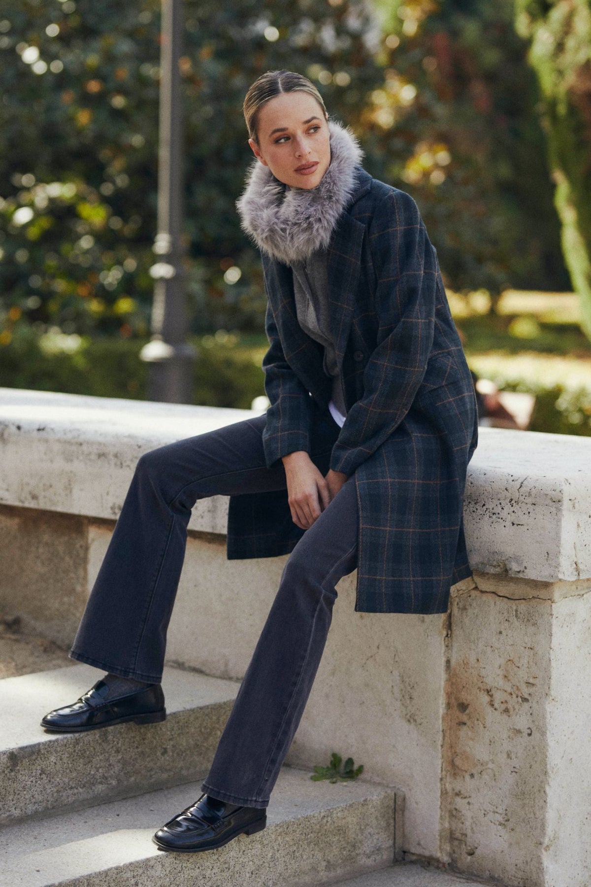 Abrigo largo de paño con estampado de cuadros en tonos azul marino y finas líneas en contraste. De corte recto, presenta cuello con solapas, cierre de doble botonadura y bolsillos con solapa a ambos lados. Su diseño clásico y favorecedor se adapta con facilidad tanto a looks casual como más formales.
