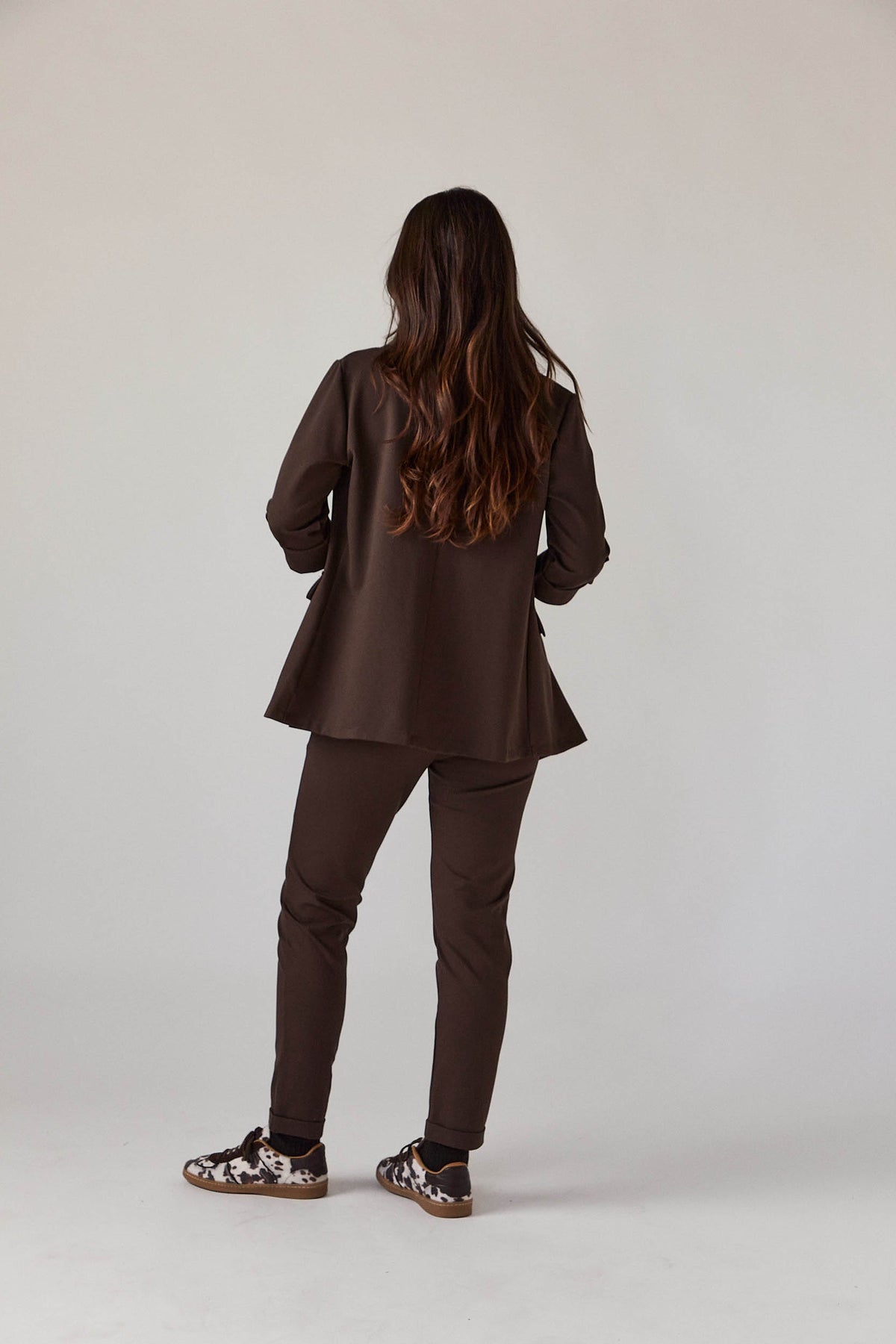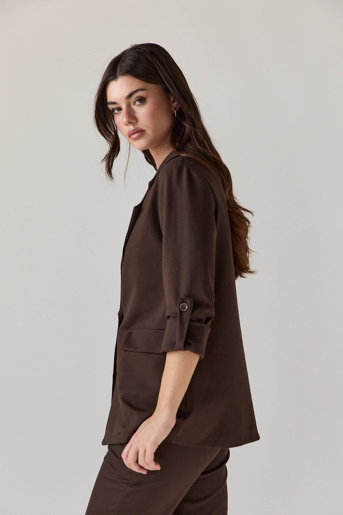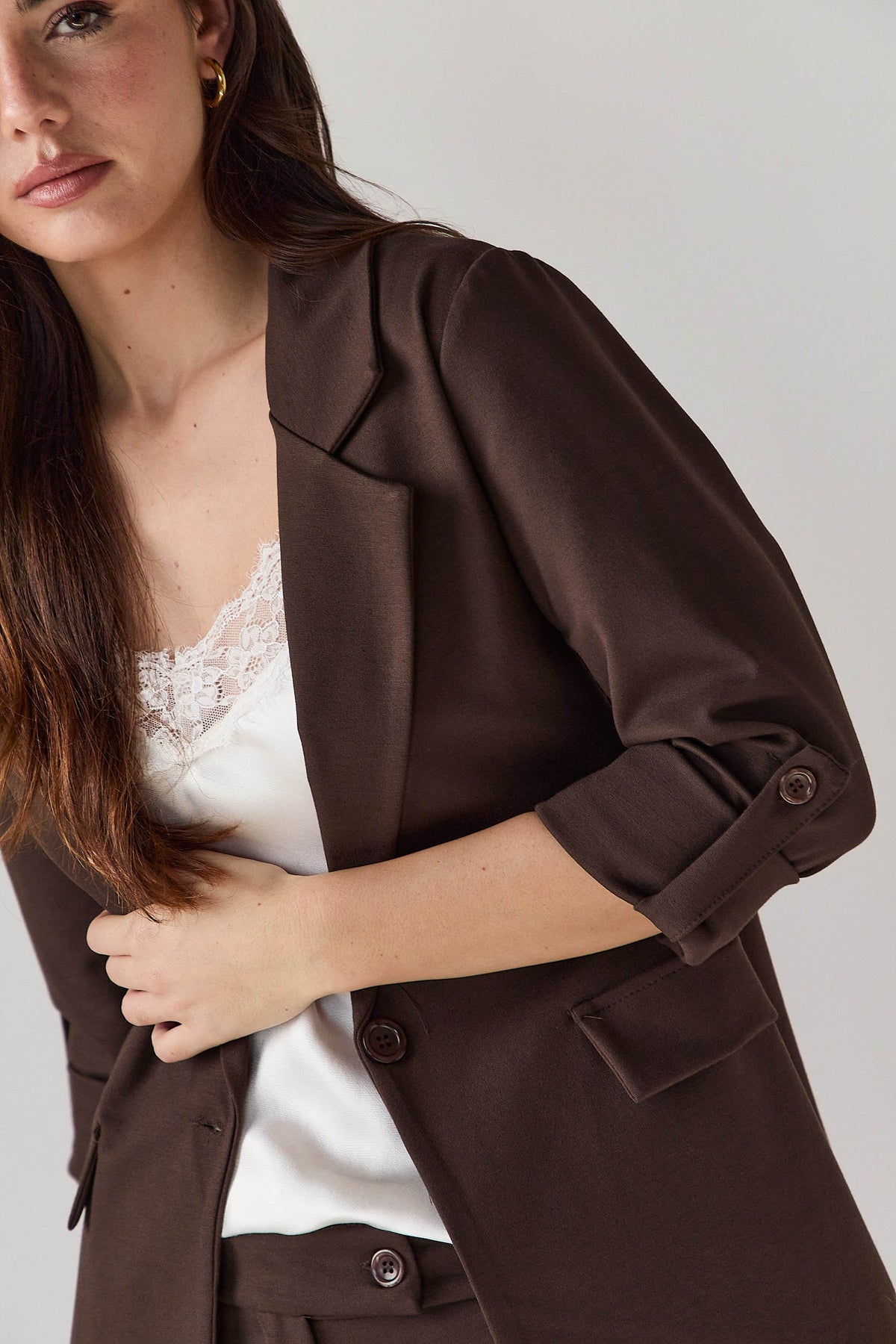 Americana de corte sastre en tono marrón oscuro, con solapa clásica y cierre frontal de un botón. Presenta manga tres cuartos con vuelta y trabilla, un detalle que aporta un toque desenfadado al diseño estructurado. Incluye bolsillos con tapa y un fit recto que estiliza sin ajustar.