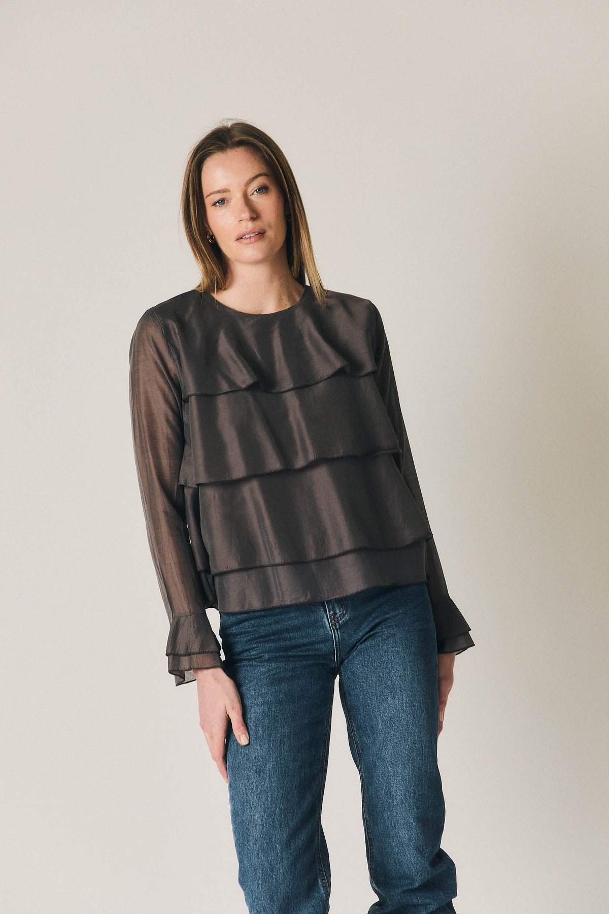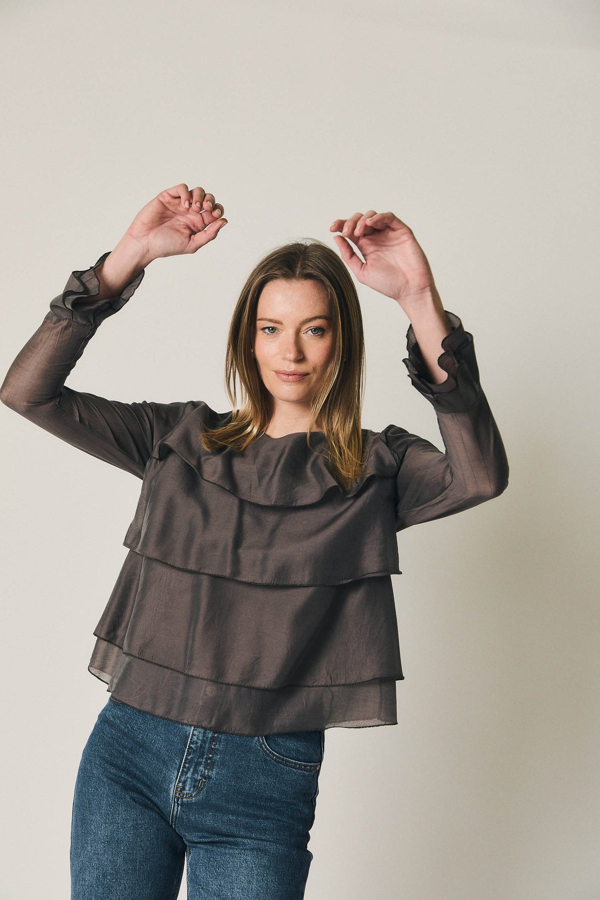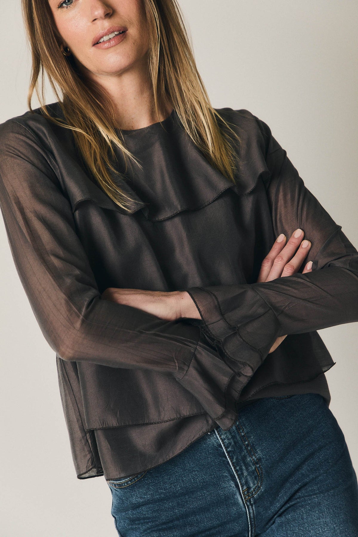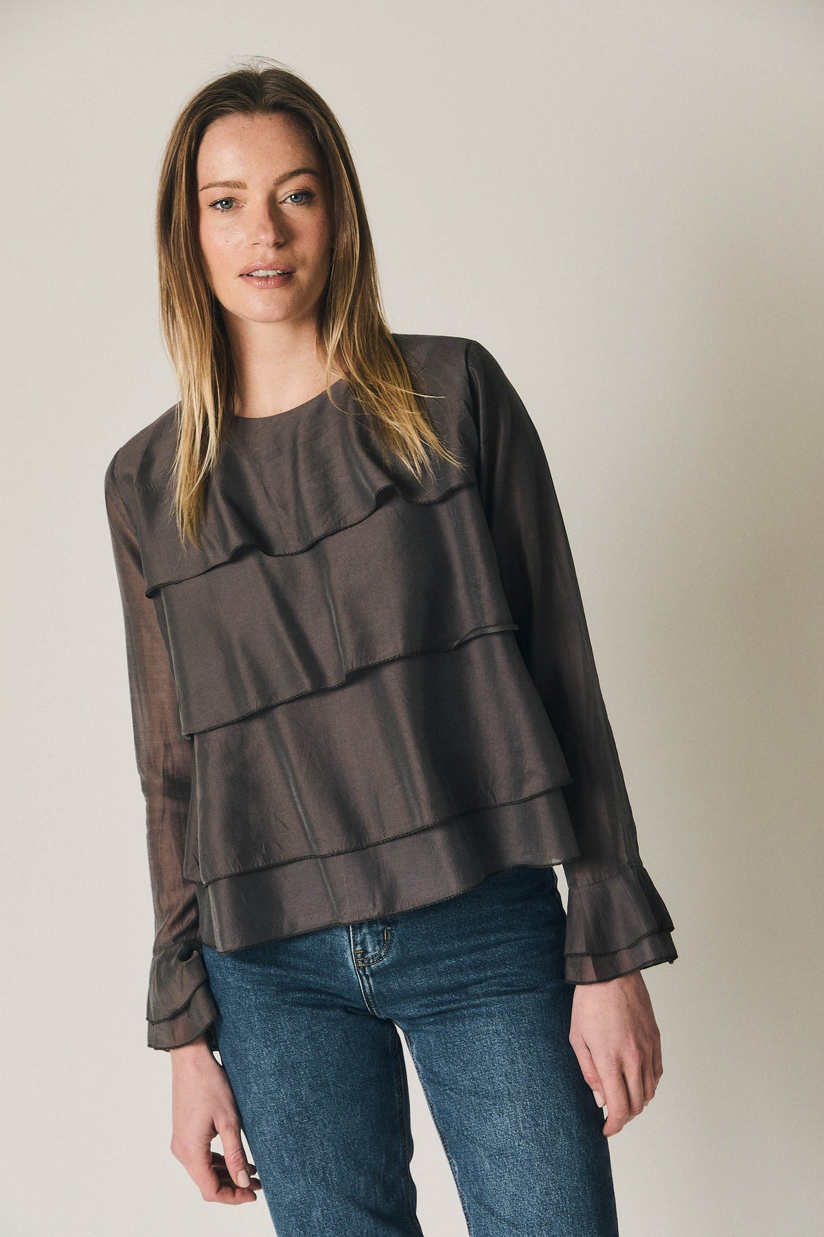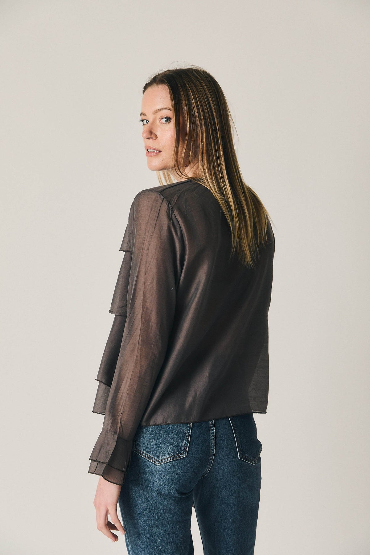 Blusa ligera en tono marrón con diseño de capas superpuestas que aportan movimiento y un acabado delicado. Cuello redondo, manga larga ligeramente transparente y bajo recto que define la silueta sin ajustarla. El juego de volúmenes crea una prenda sutil y equilibrada, pensada para aportar textura visual al look.