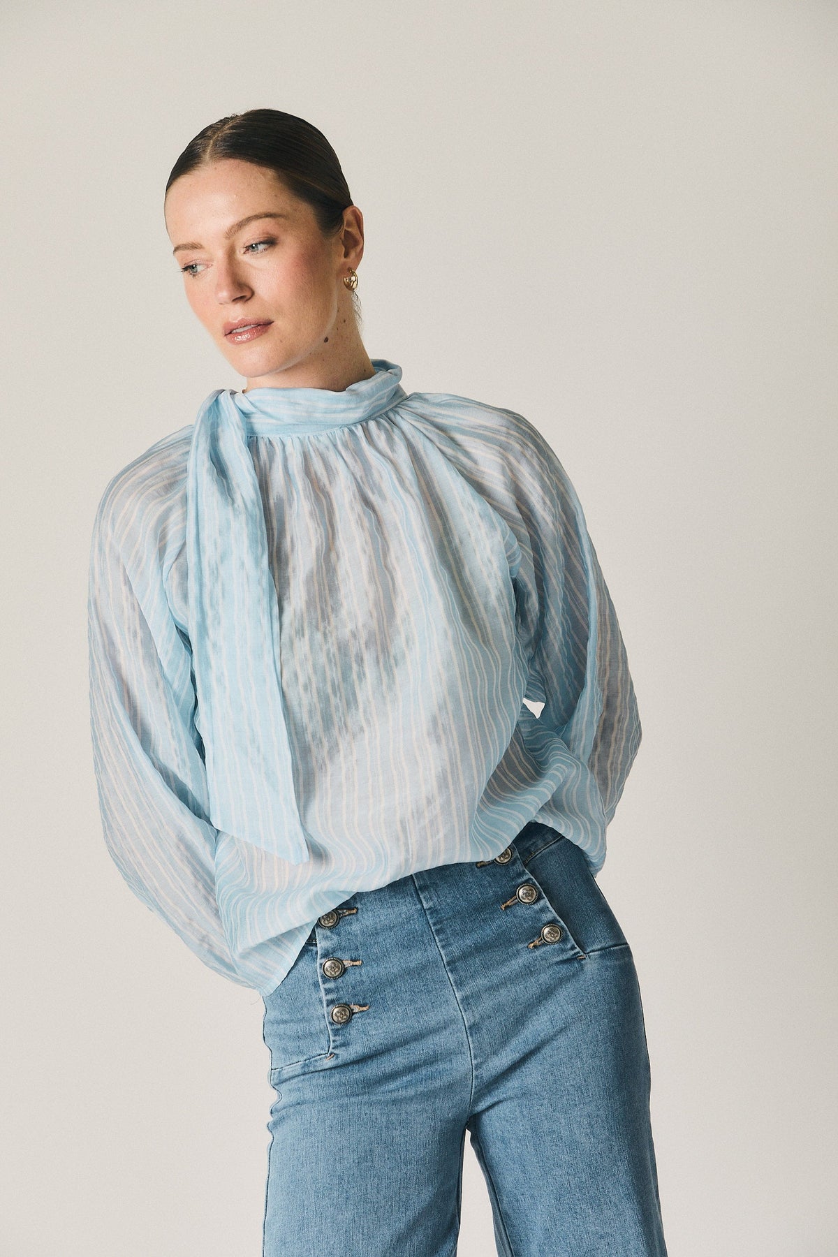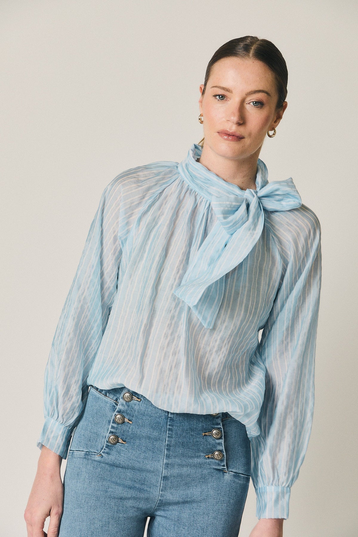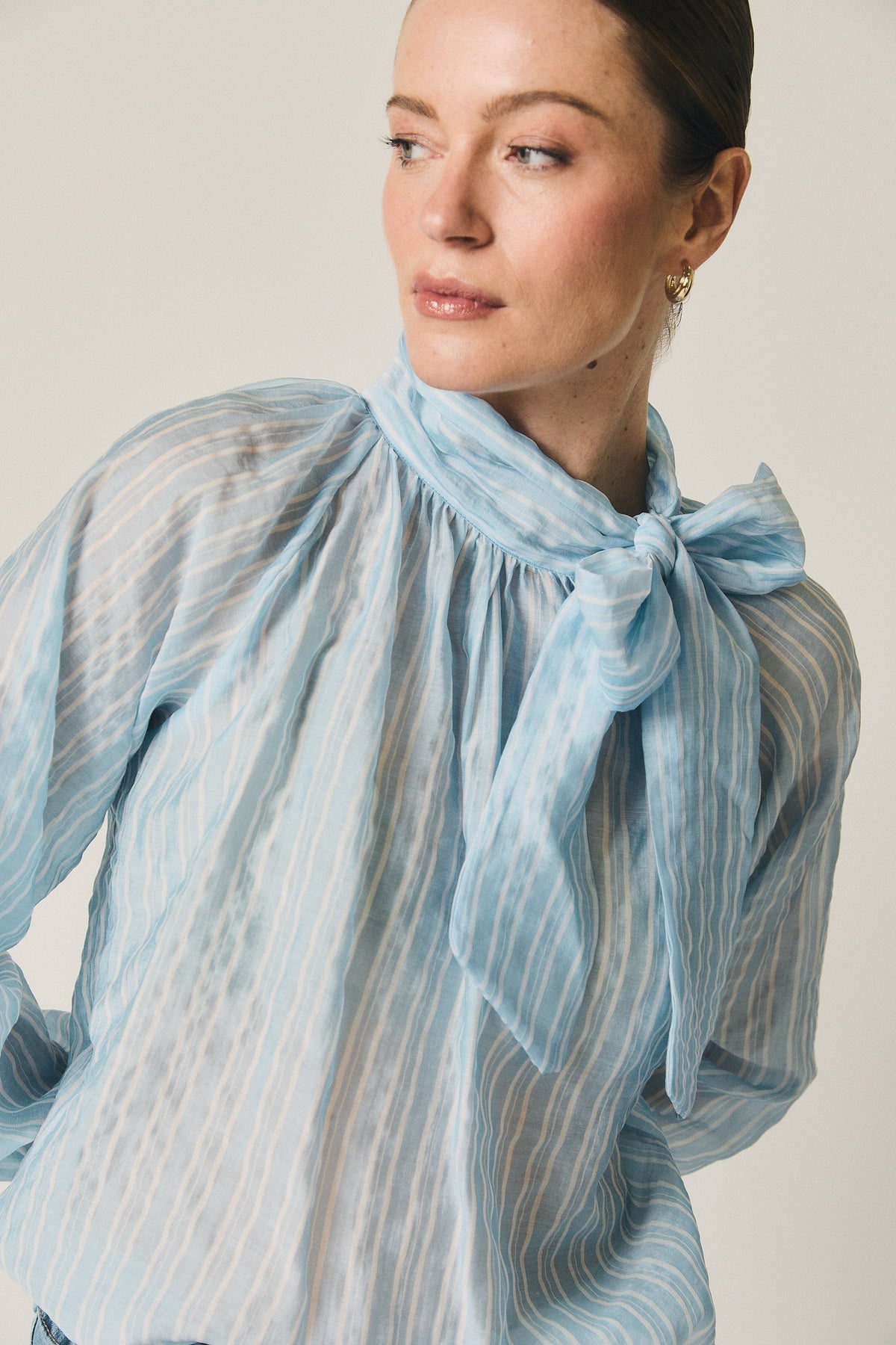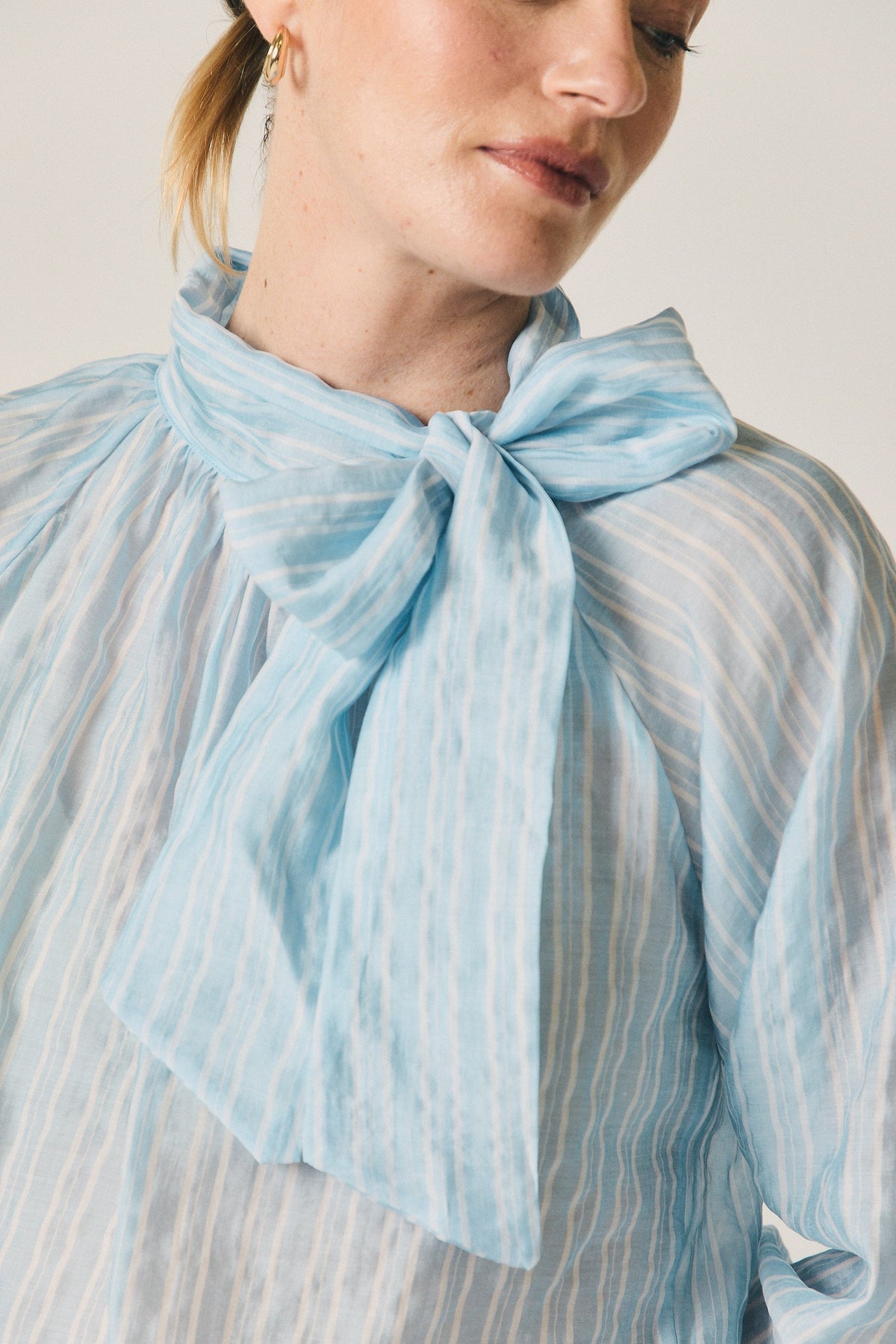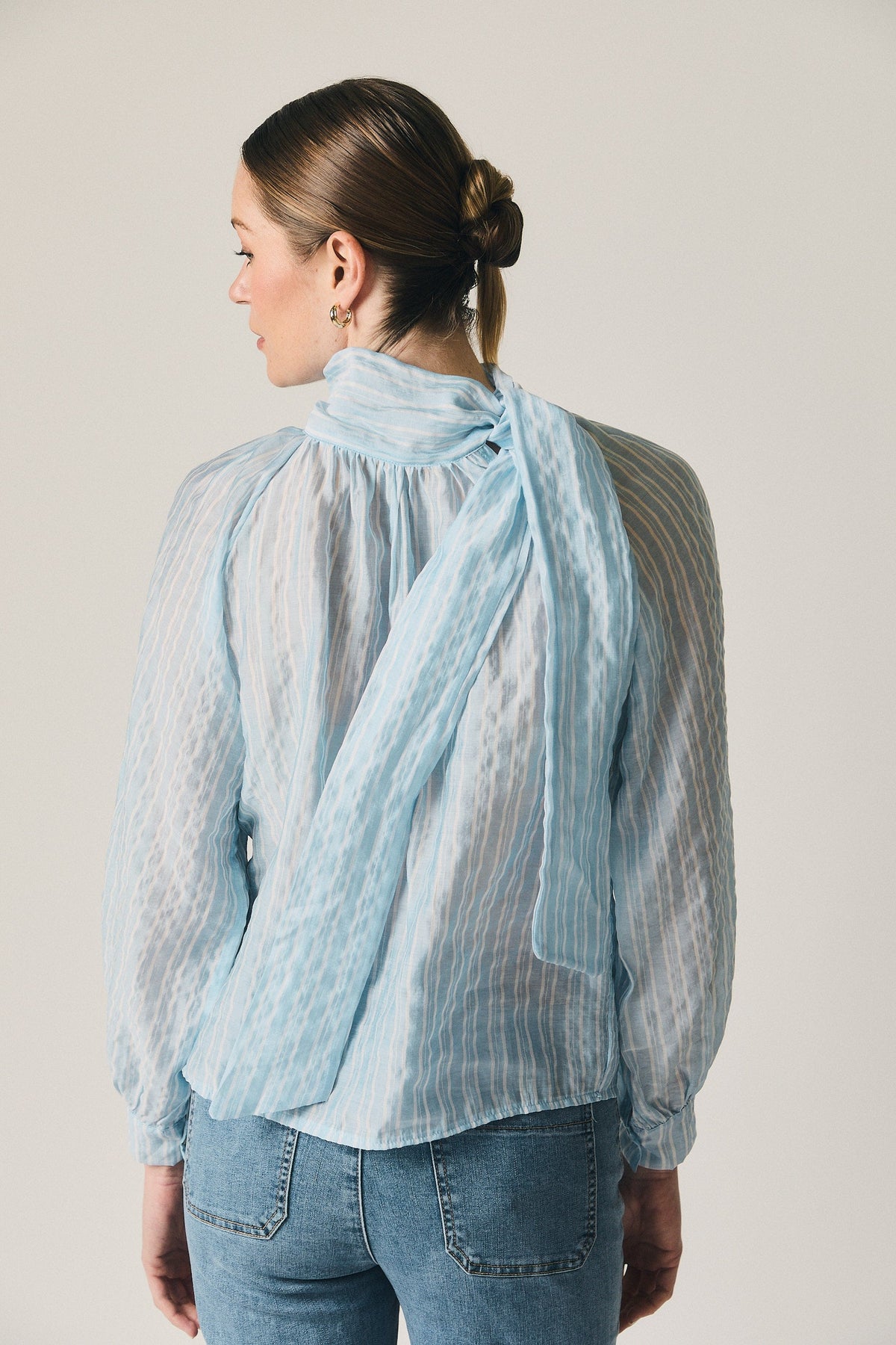 Blusa en tono celeste con estampado de rayas verticales y efecto ligeramente translúcido. Diseño de cuello cerrado con lazada larga integrada, que permite llevarla anudada o suelta según el estilo. Presenta manga larga con volumen suave y puño elástico, y un fruncido ligero en el escote que aporta movimiento y caída fluida.