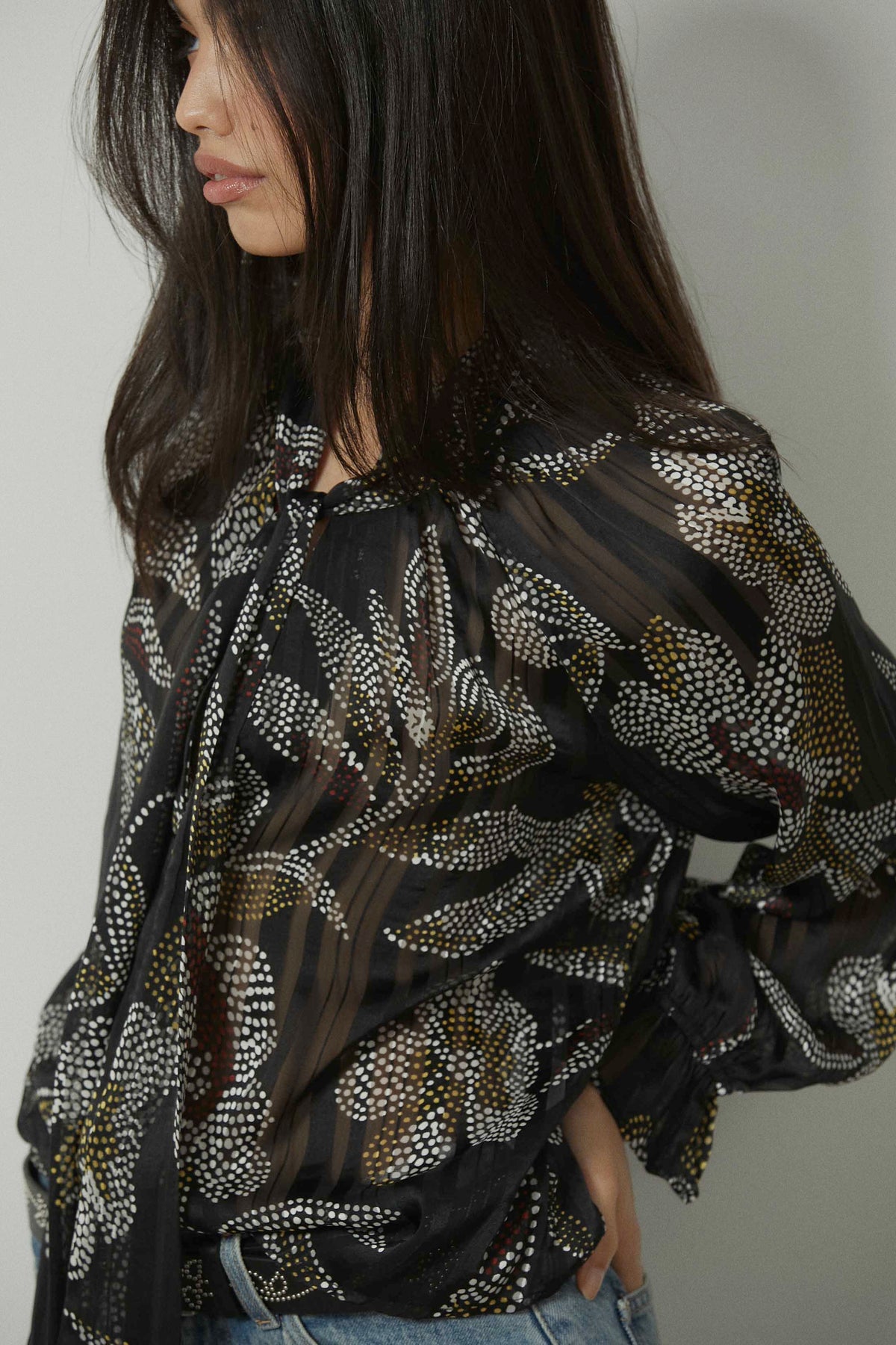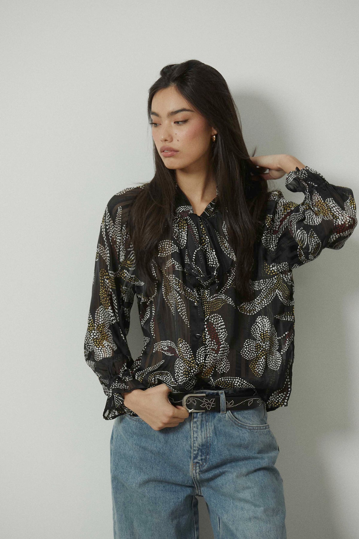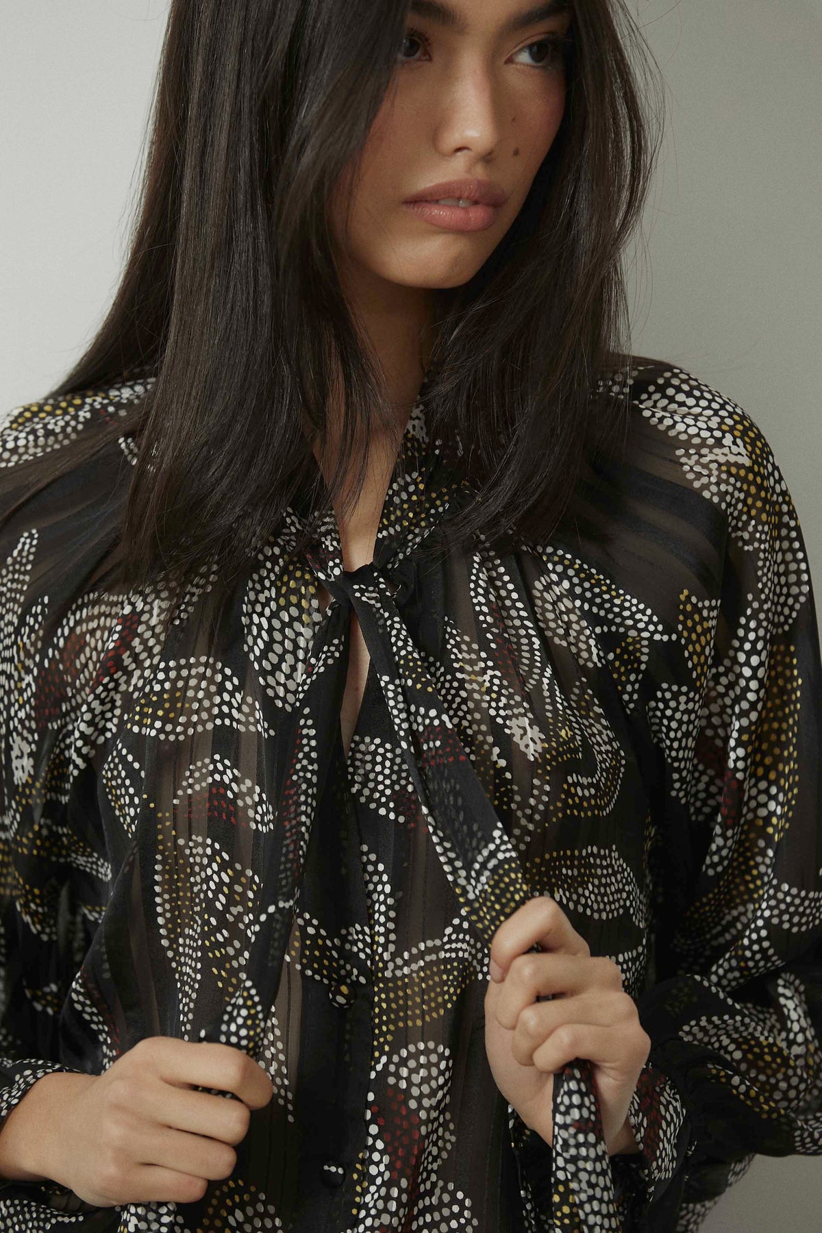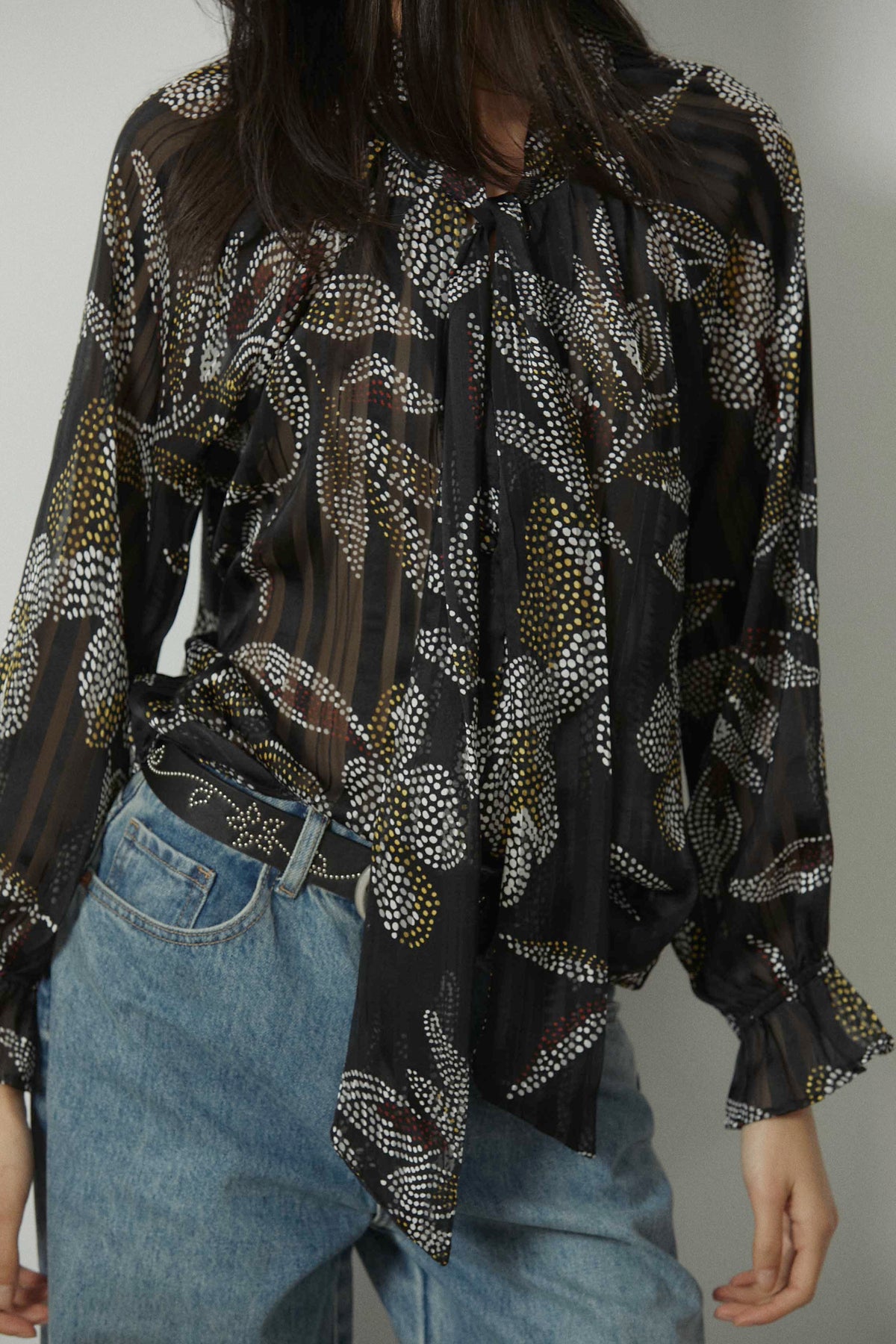 Blusa con estampado floral de pequeños dots en contraste sobre fondo negro. Diseño con cuello fruncido y lazo maxi central que aporta caída y movimiento. Manga larga semitransparente con puño ligeramente fruncido y silueta fluida de largo a la cadera.