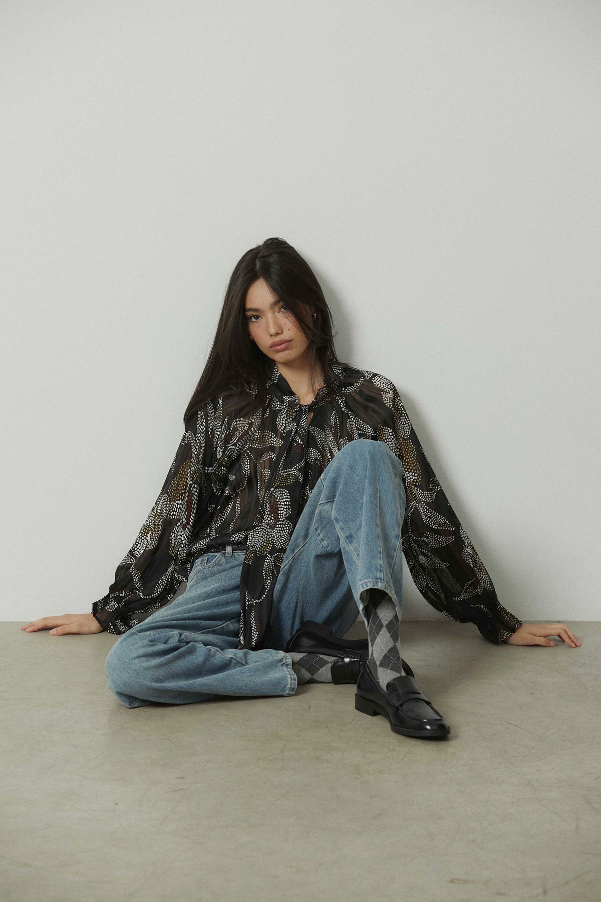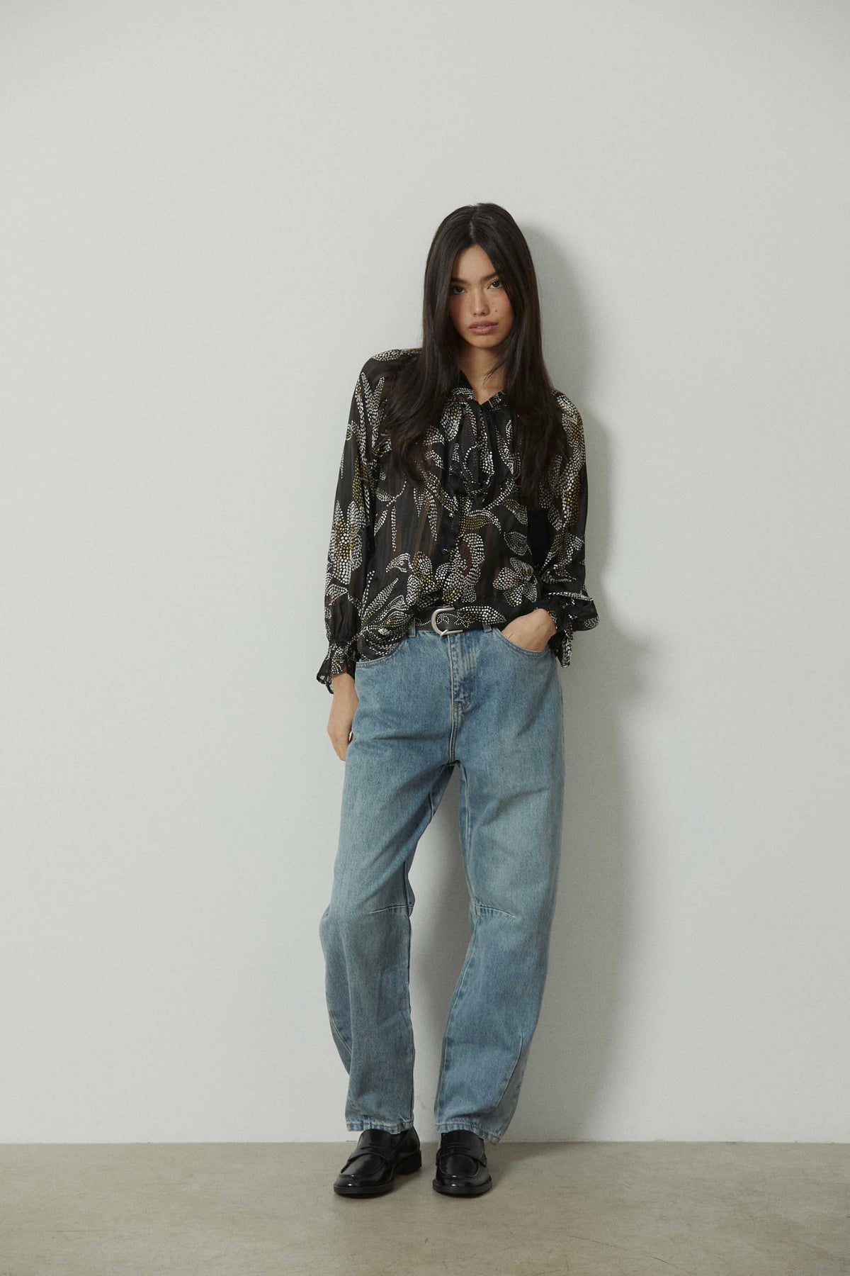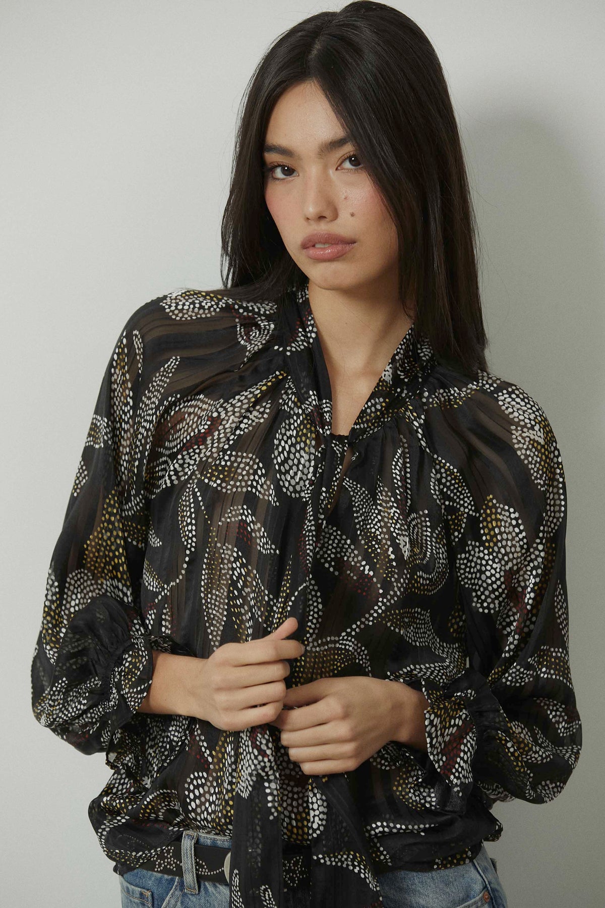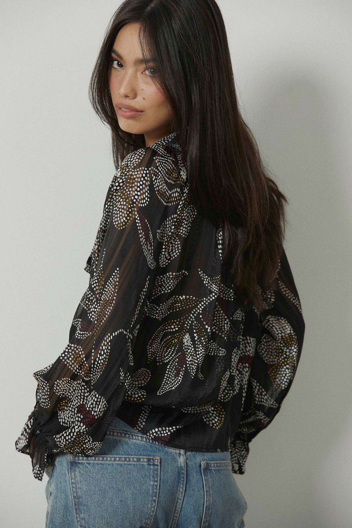 Blusa con estampado floral de pequeños dots en contraste sobre fondo negro. Diseño con cuello fruncido y lazo maxi central que aporta caída y movimiento. Manga larga semitransparente con puño ligeramente fruncido y silueta fluida de largo a la cadera.