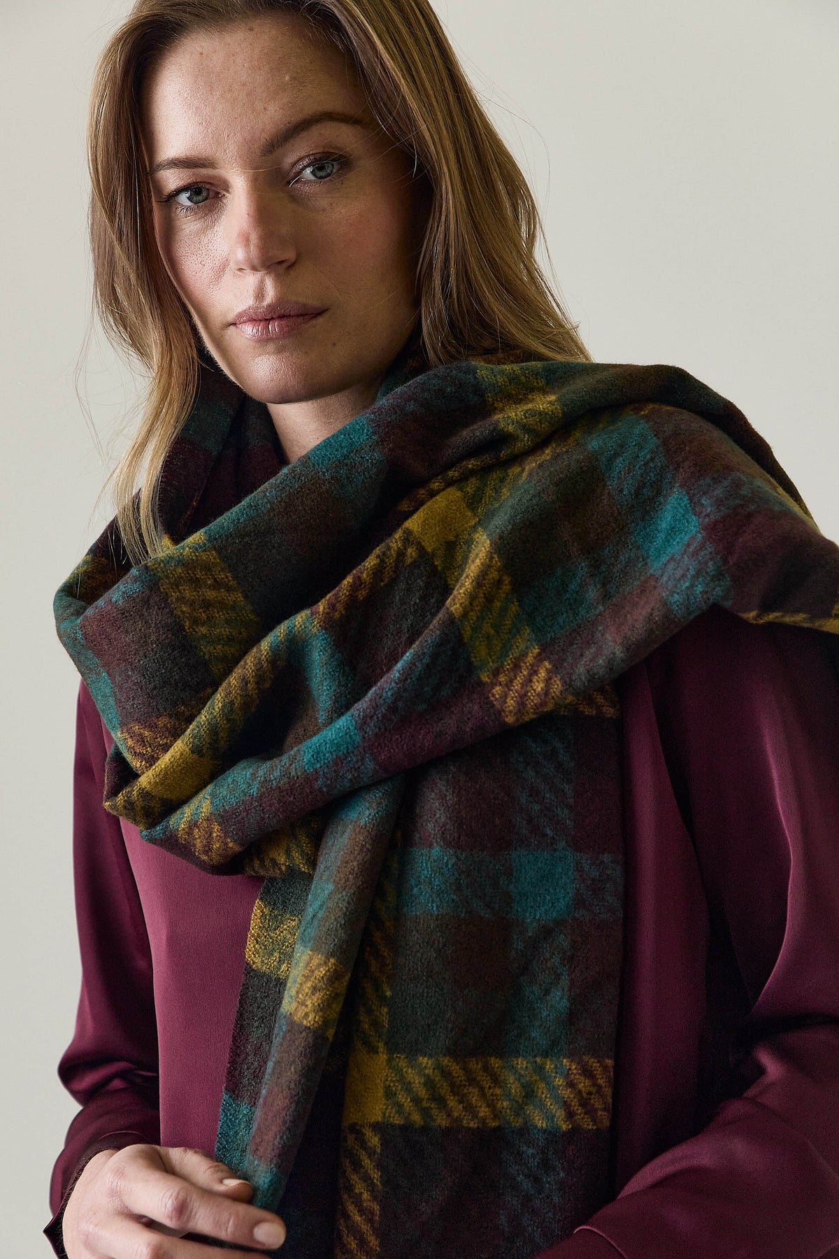 Bufanda de cuadros en una combinación de tonos lima, verde, burdeos y amarillo mostaza. Su diseño presenta un cuadro clásico de tamaño medio y flecos largos que aportan textura y movimiento.