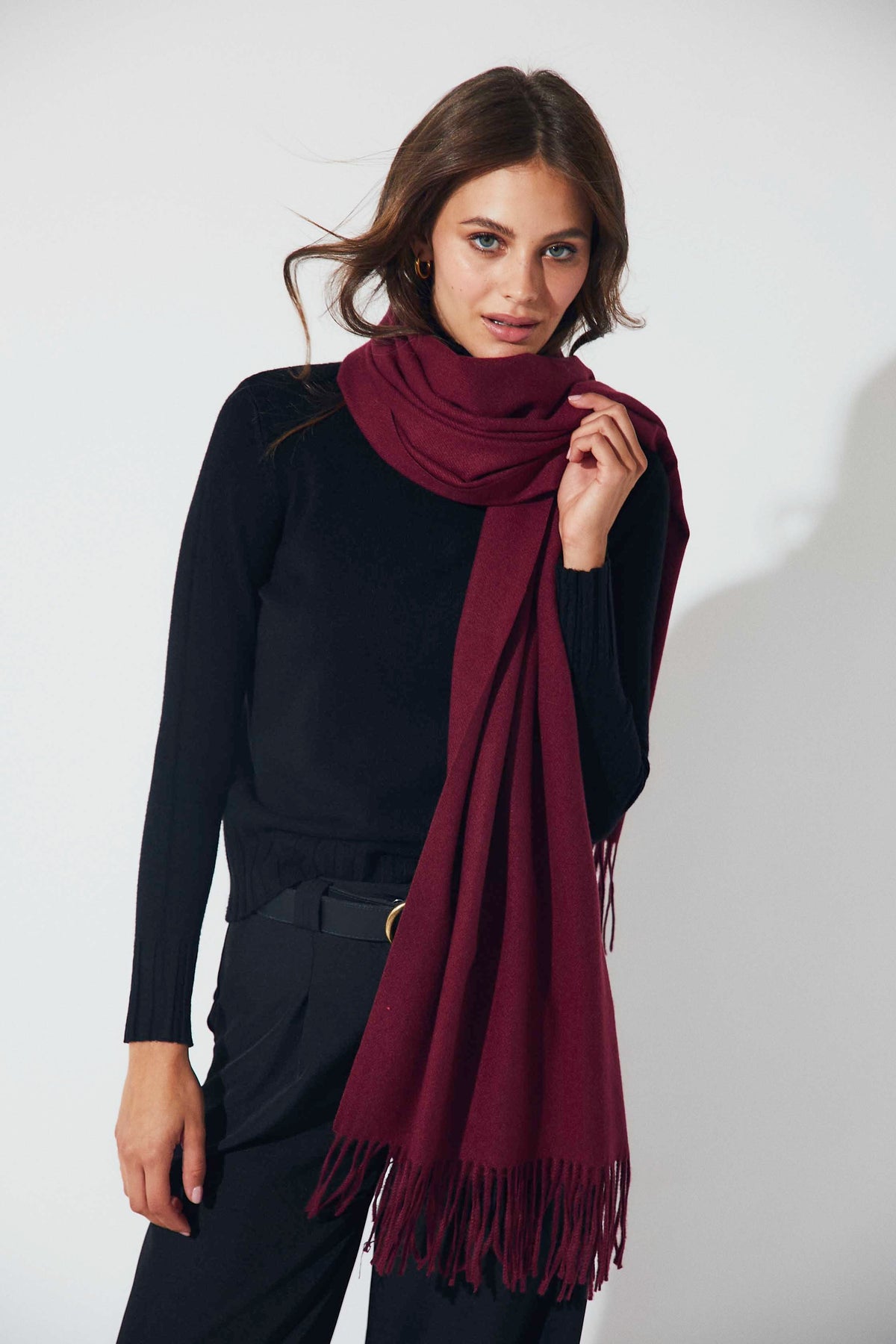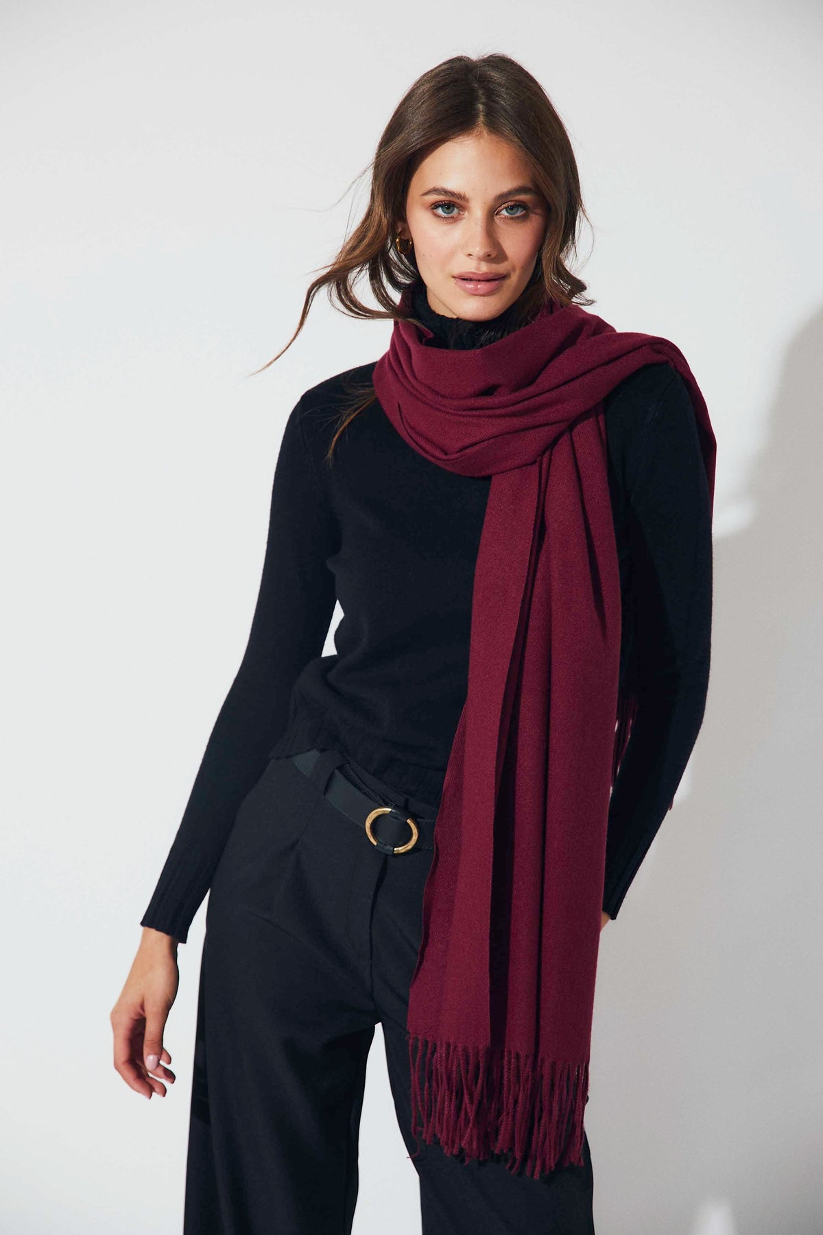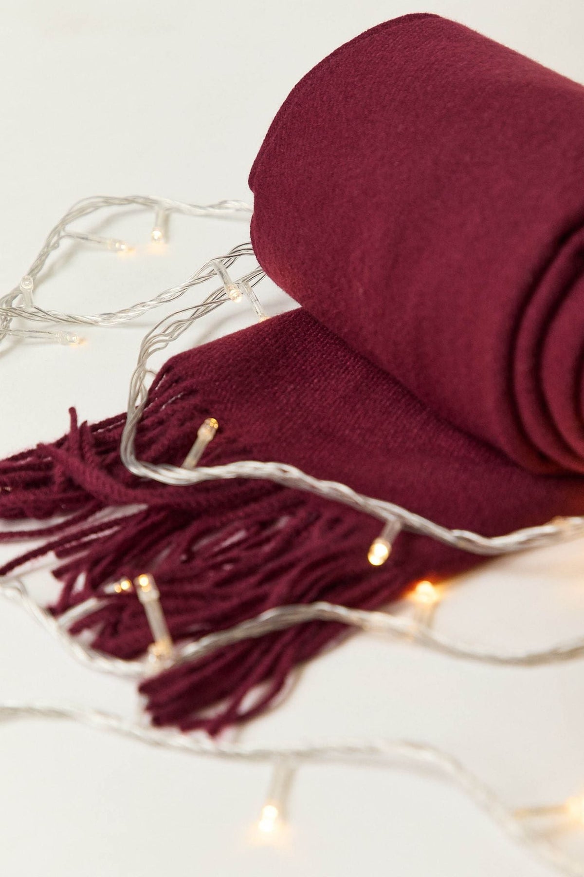 Bufanda lisa en tono burdeos, de tacto suave y acabado con flecos en los extremos. Su diseño sencillo y alargado la convierte en un básico imprescindible para completar los looks de invierno con un toque cálido y elegante.