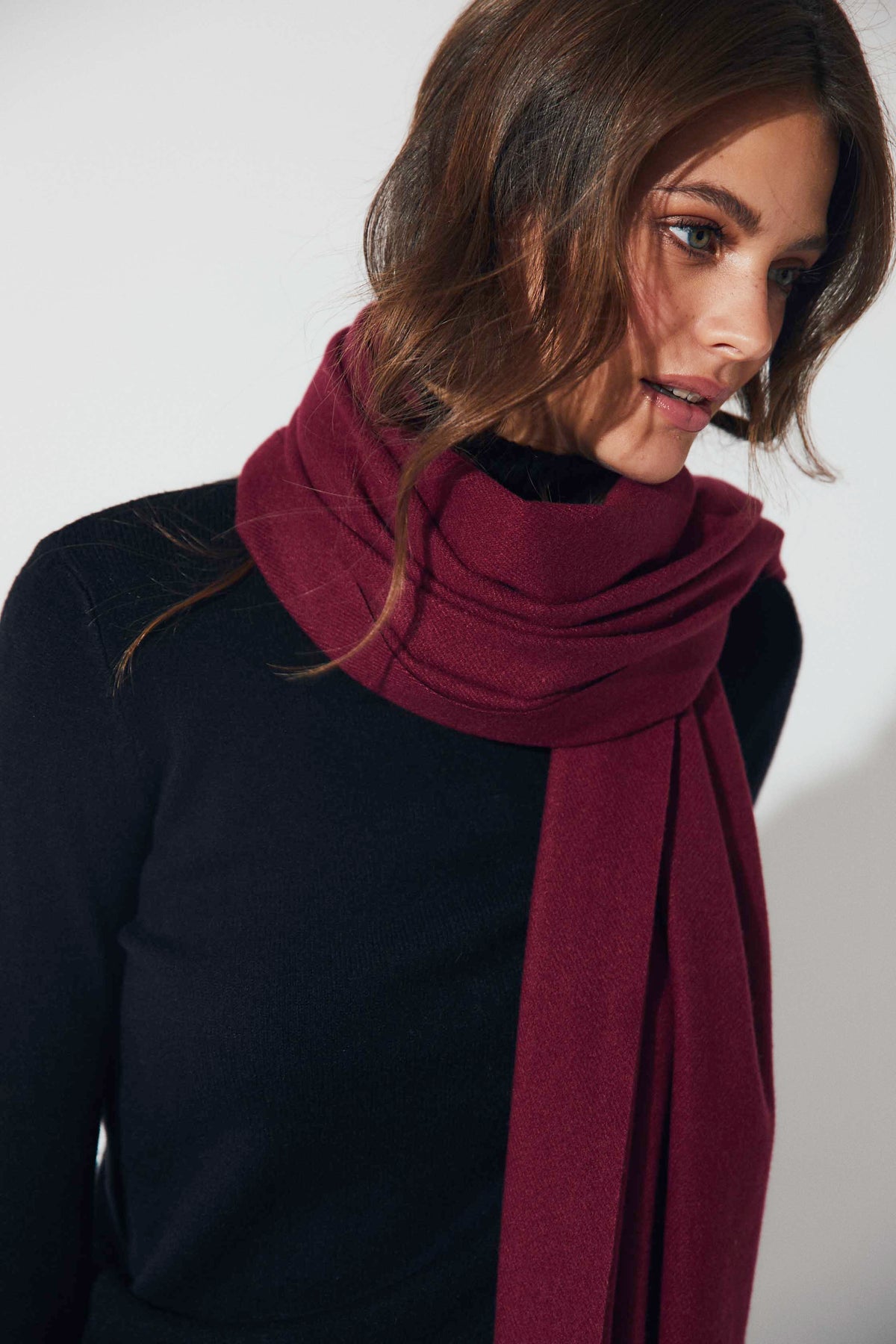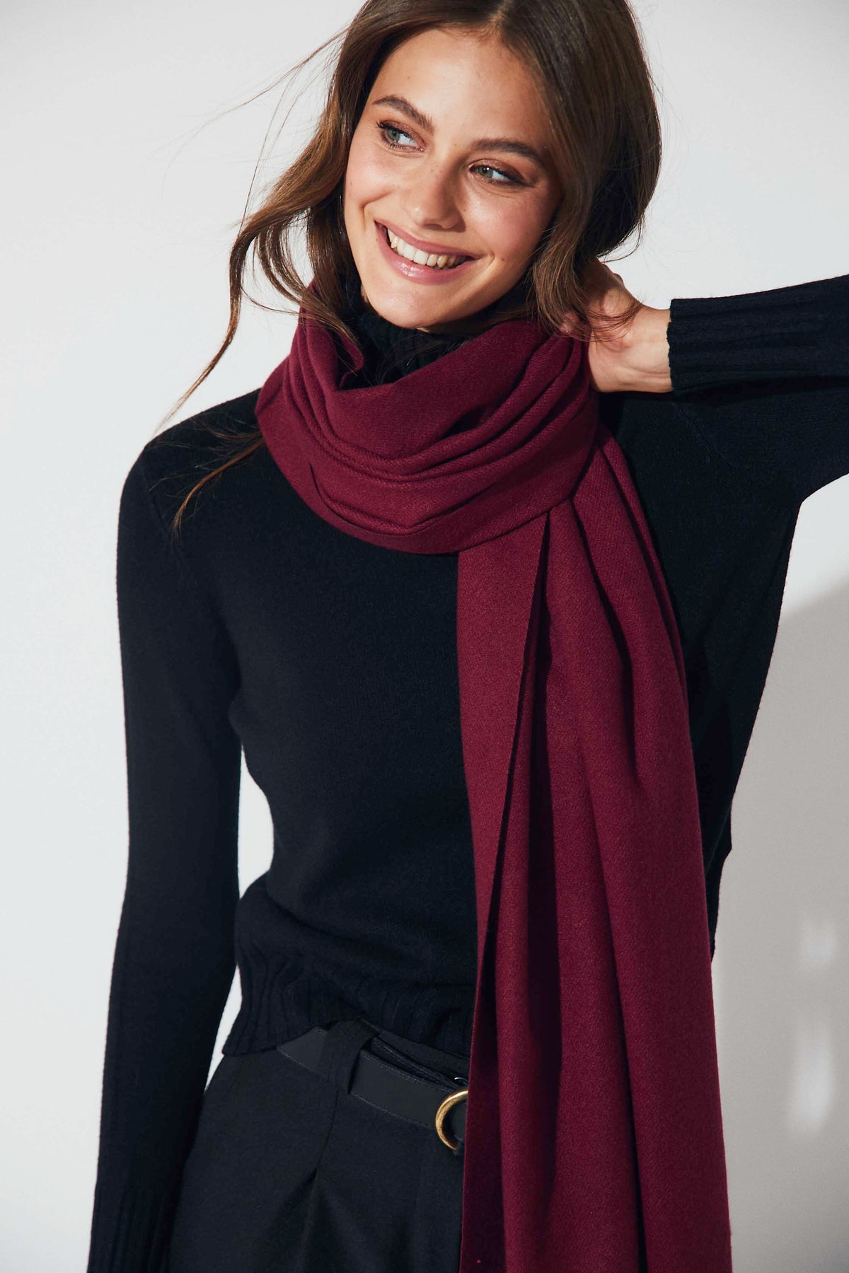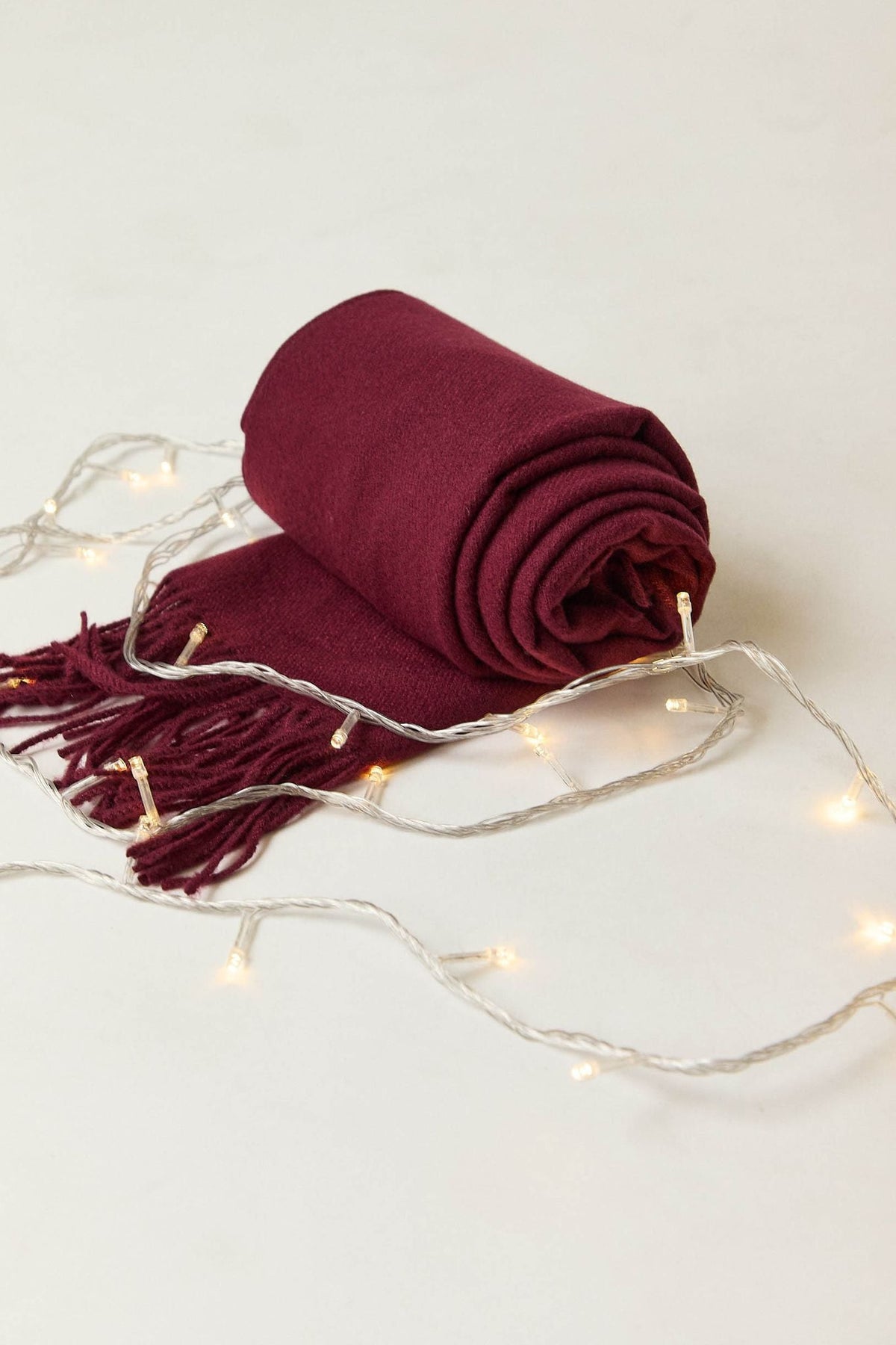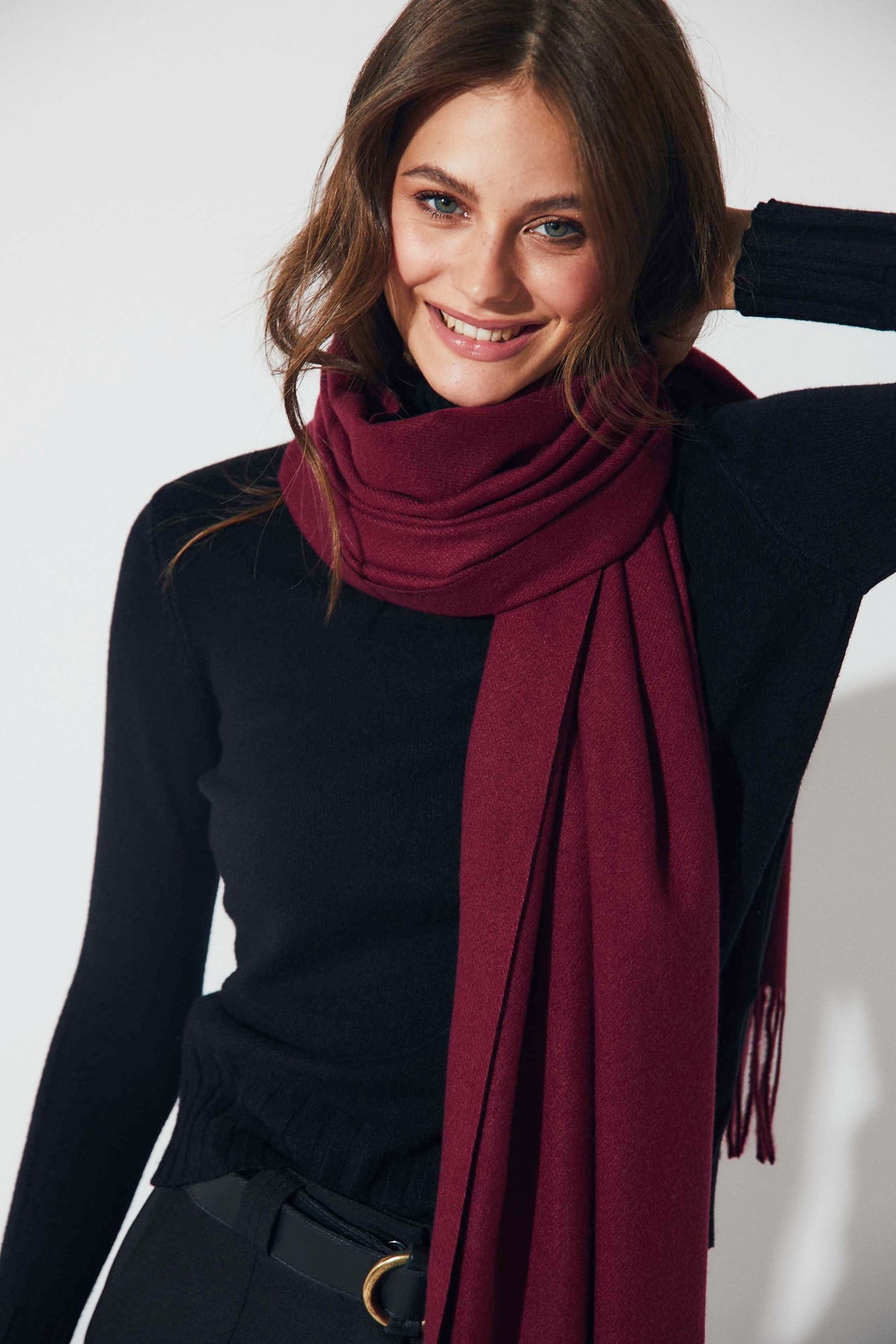Bufanda lisa en tono burdeos, de tacto suave y acabado con flecos en los extremos. Su diseño sencillo y alargado la convierte en un básico imprescindible para completar los looks de invierno con un toque cálido y elegante.
