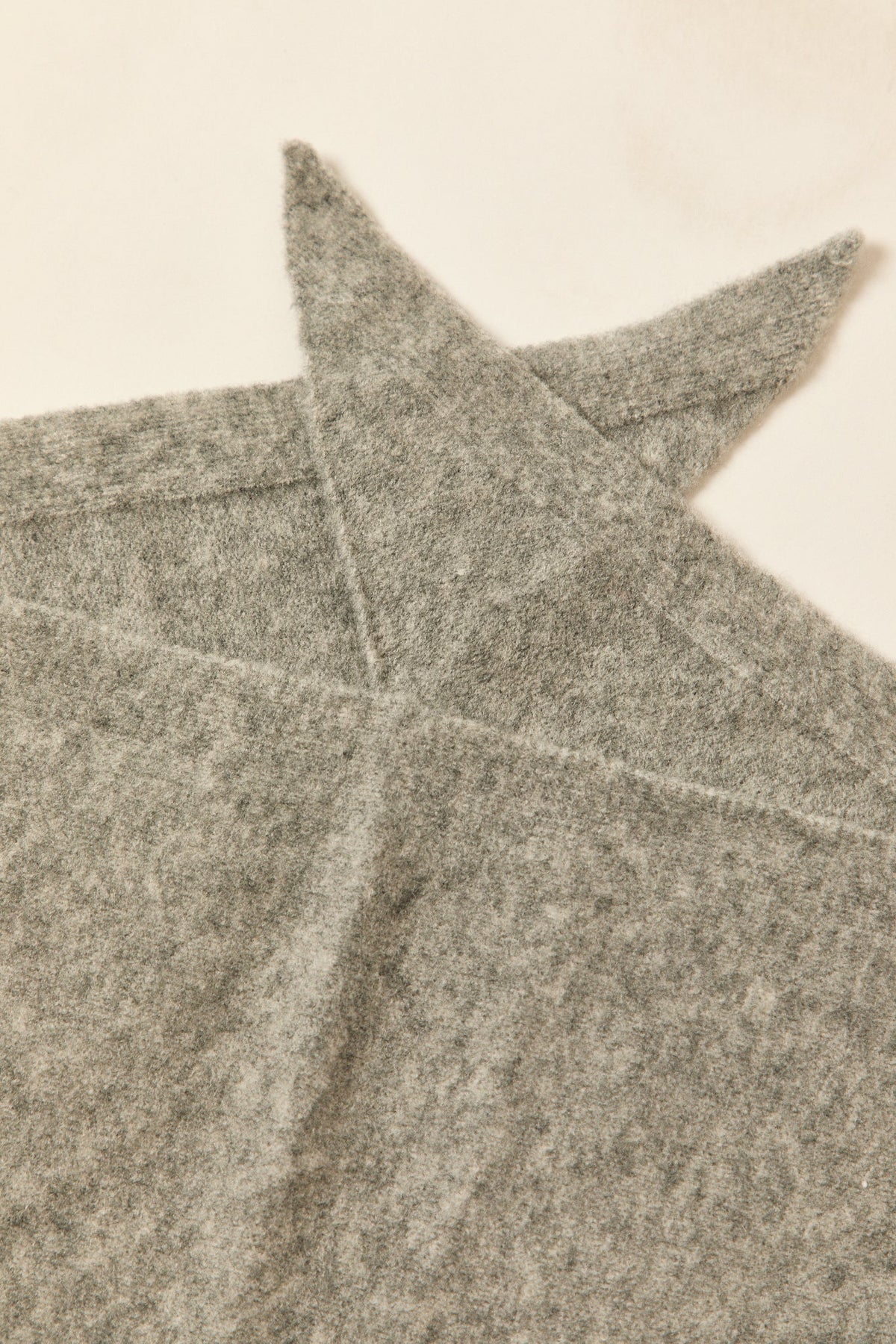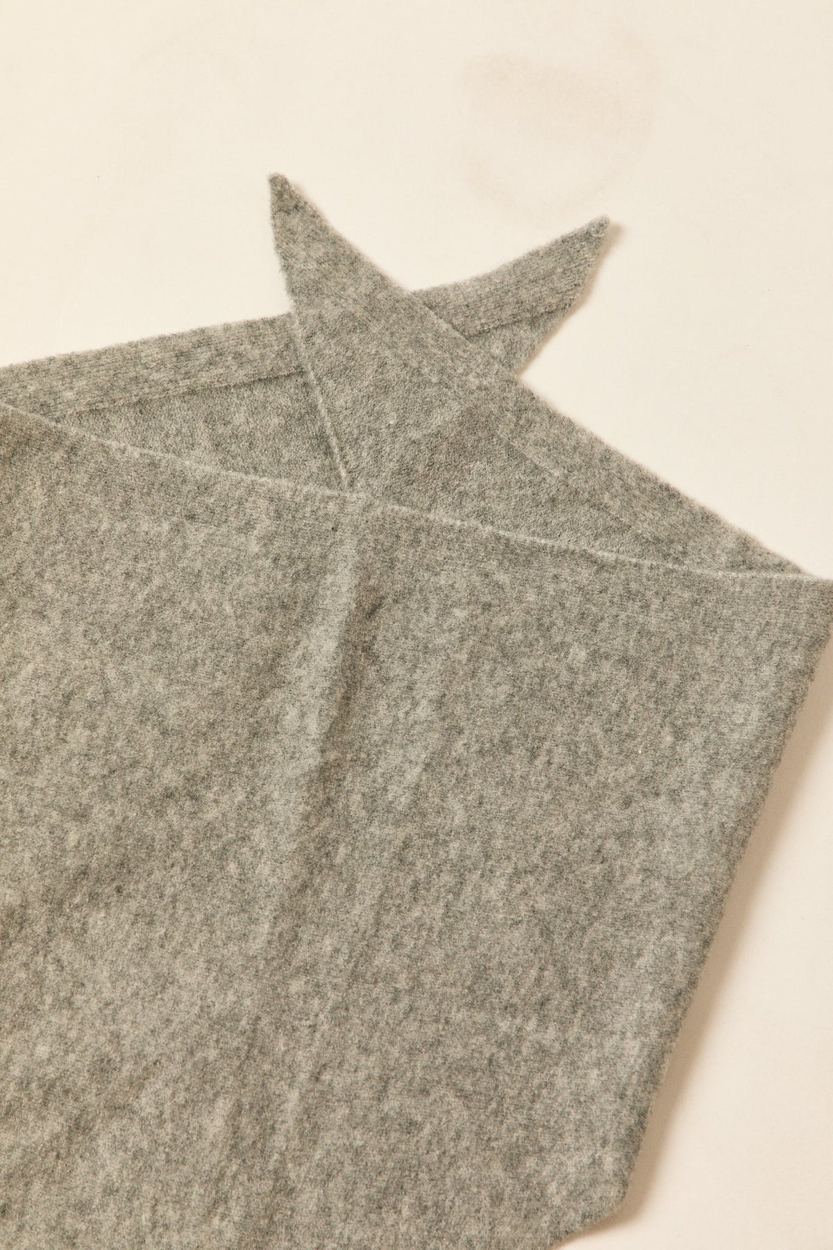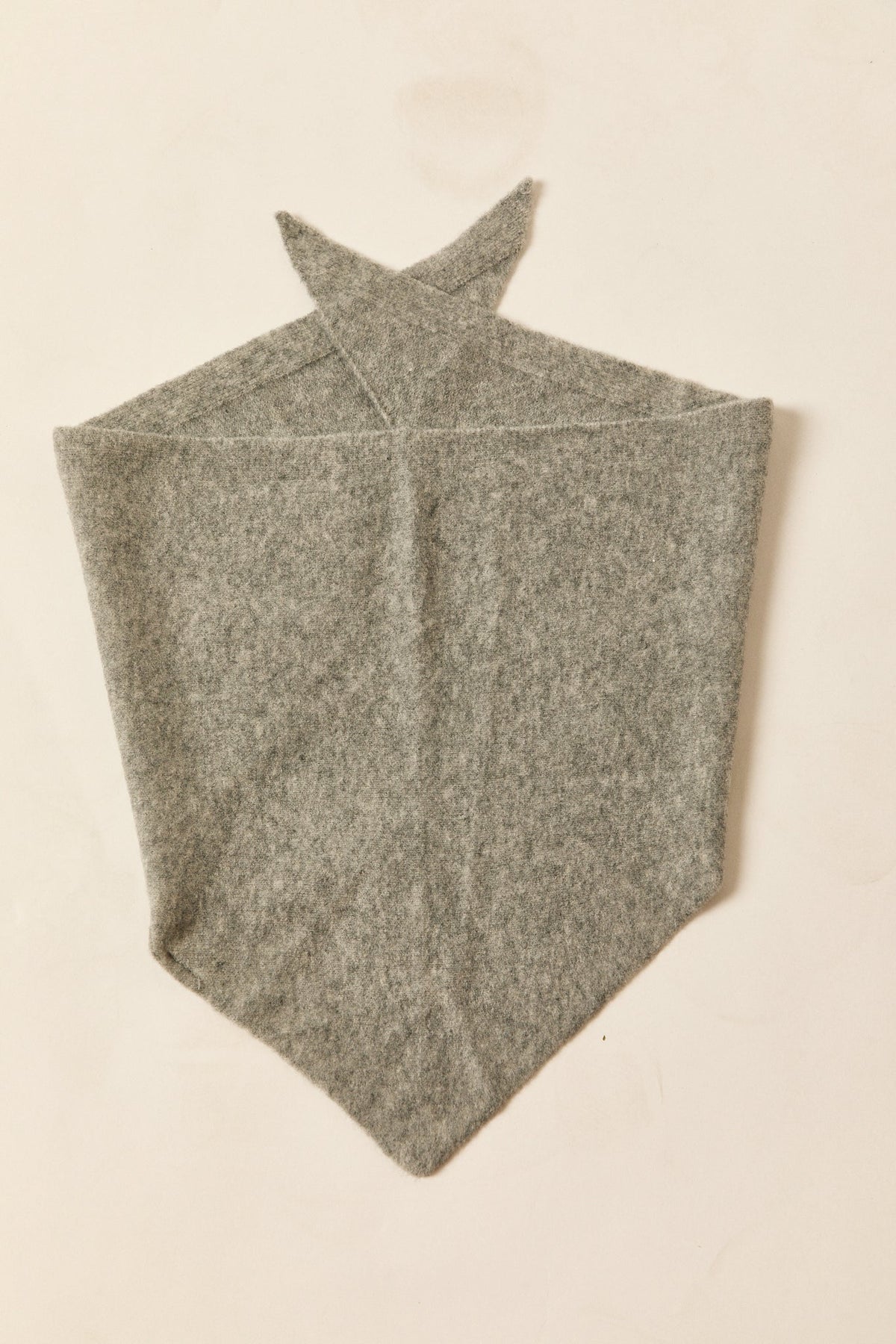 Bufanda en tono gris de diseño liso. Presenta forma triangular terminada en pico y tiras que se cruzan en el cuello para ajustar cómodamente. Su tejido suave aporta calidez en un accesorio versátil y ligero.