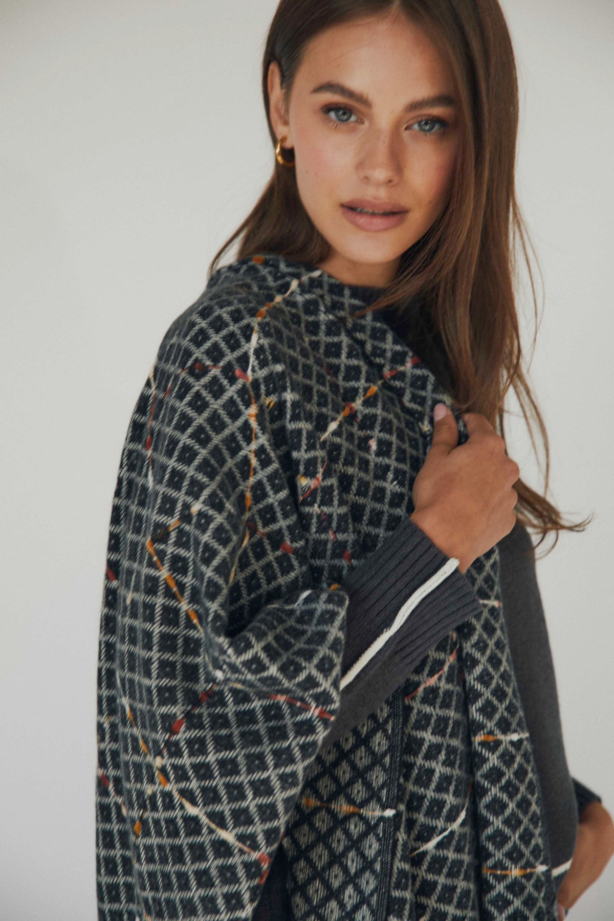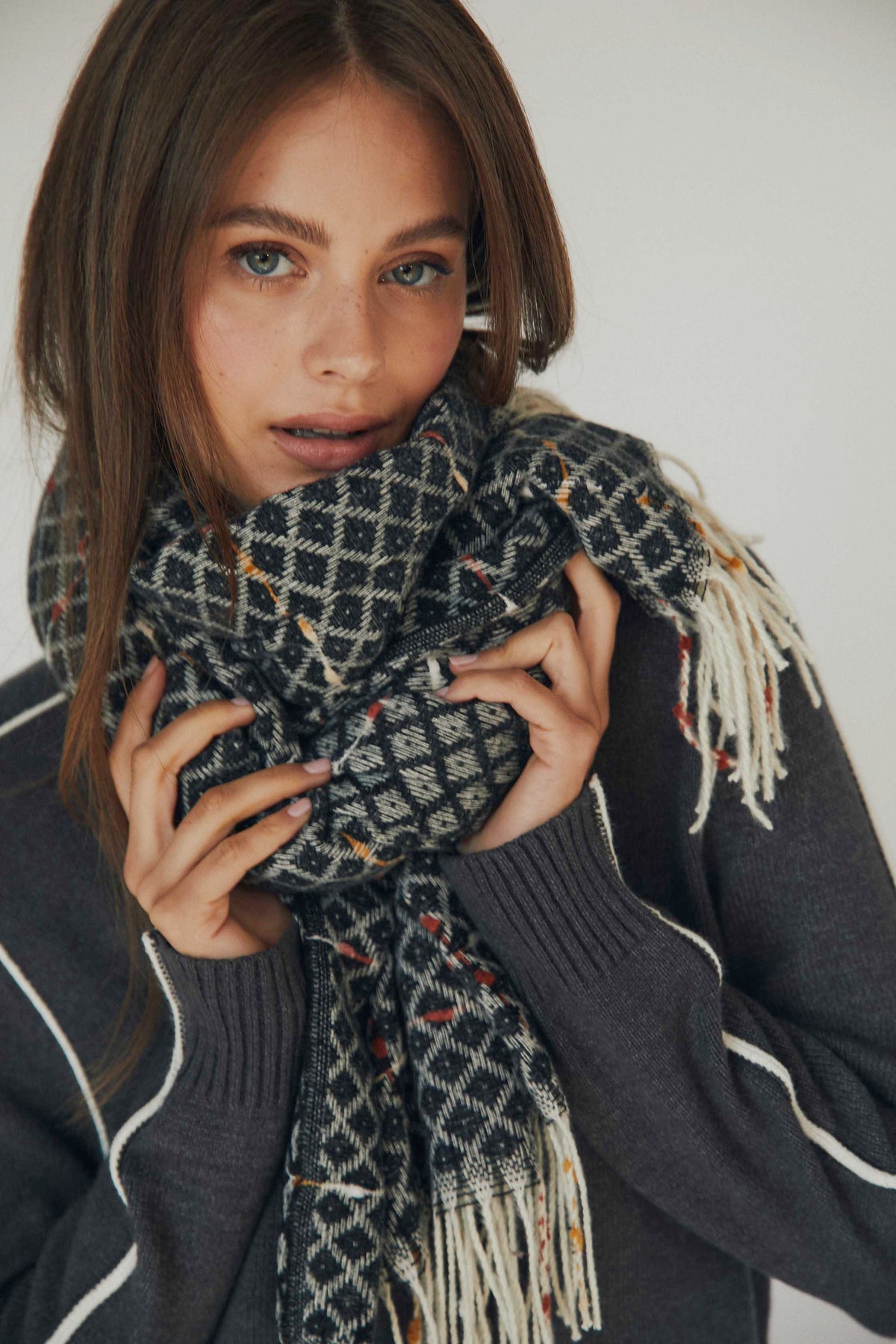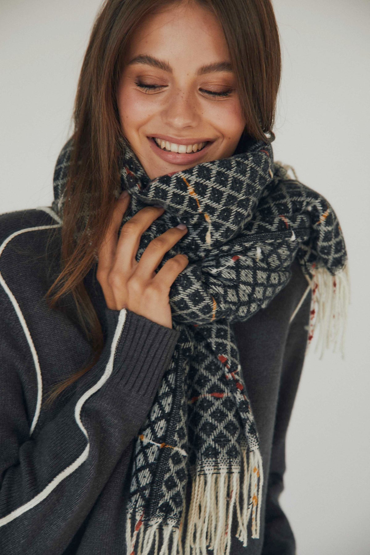 Bufanda de rombos en tonos grises con detalle de pequeños toques de color que aportan textura visual. El diseño amplio permite llevarla al cuello con volumen o caída más recta, y los flecos largos en los extremos aportan un acabado suave y desenfadado.