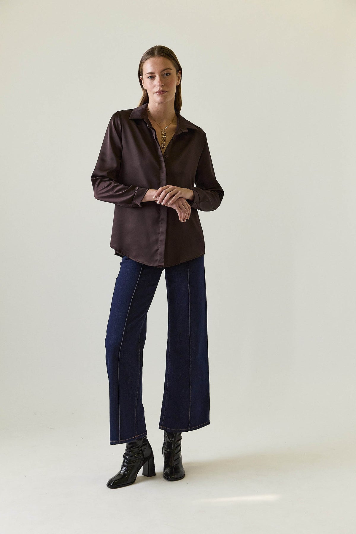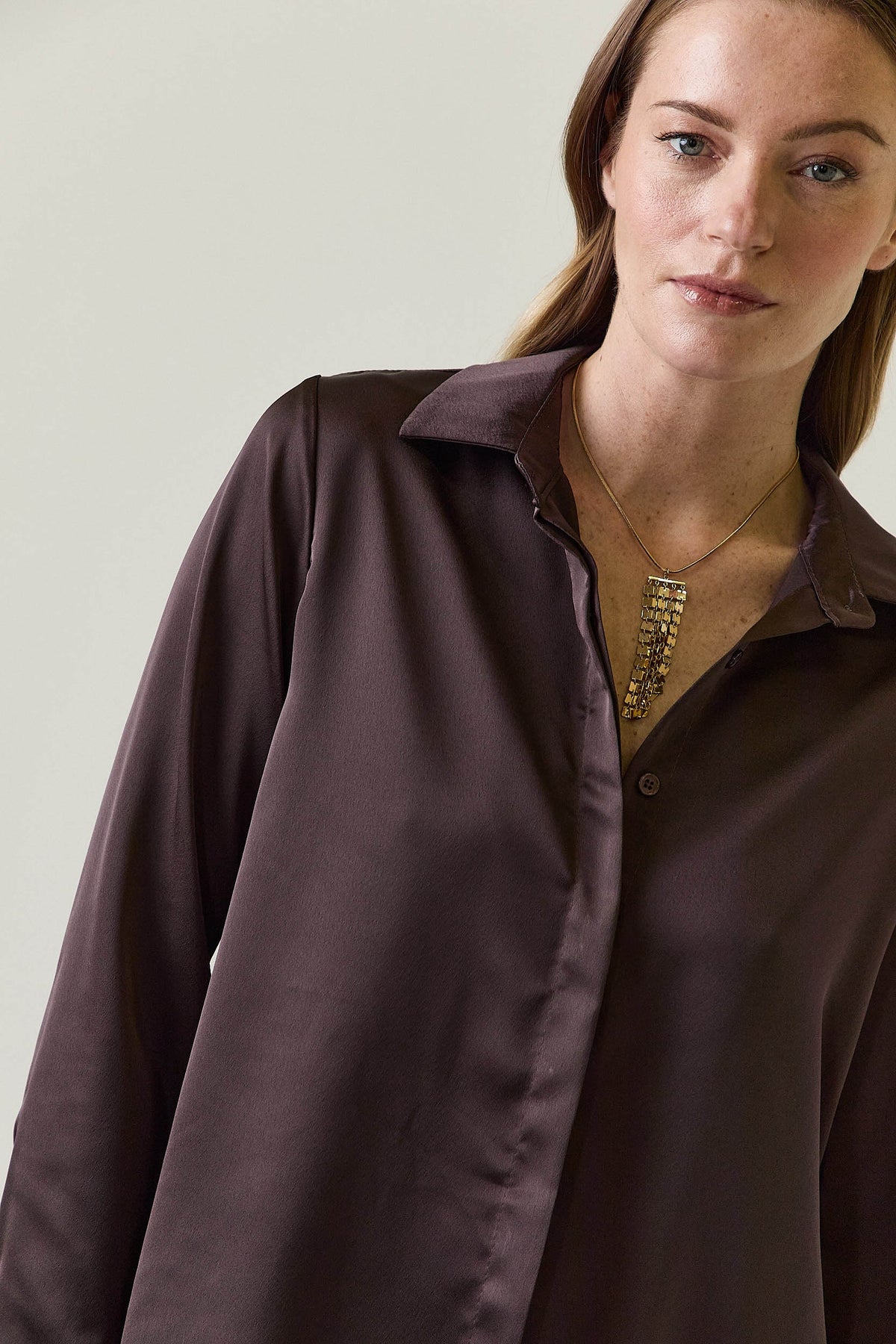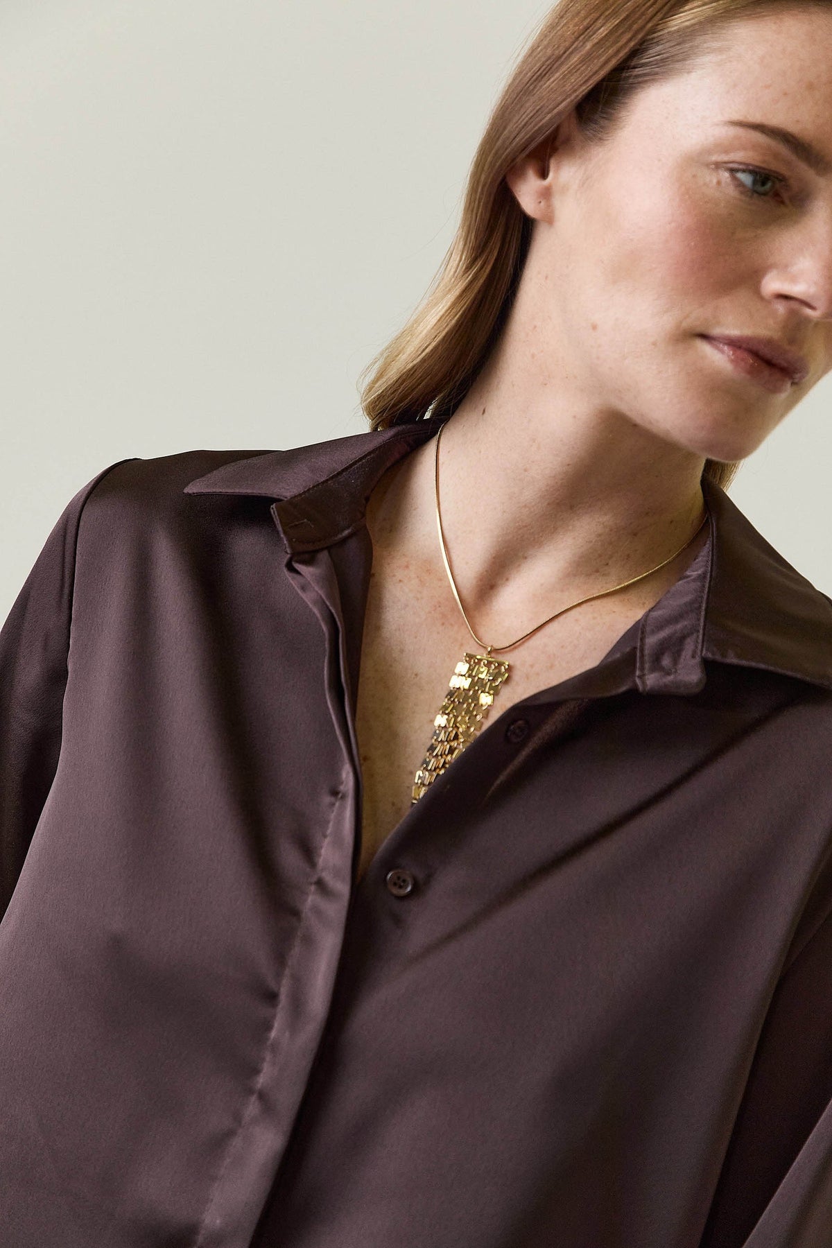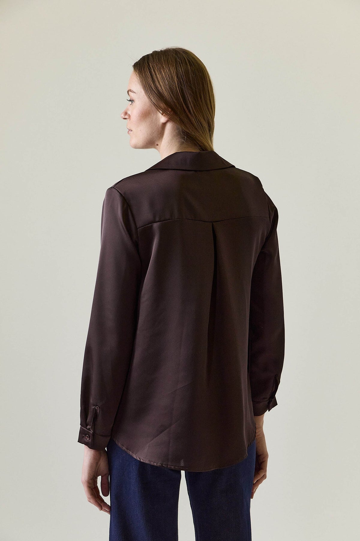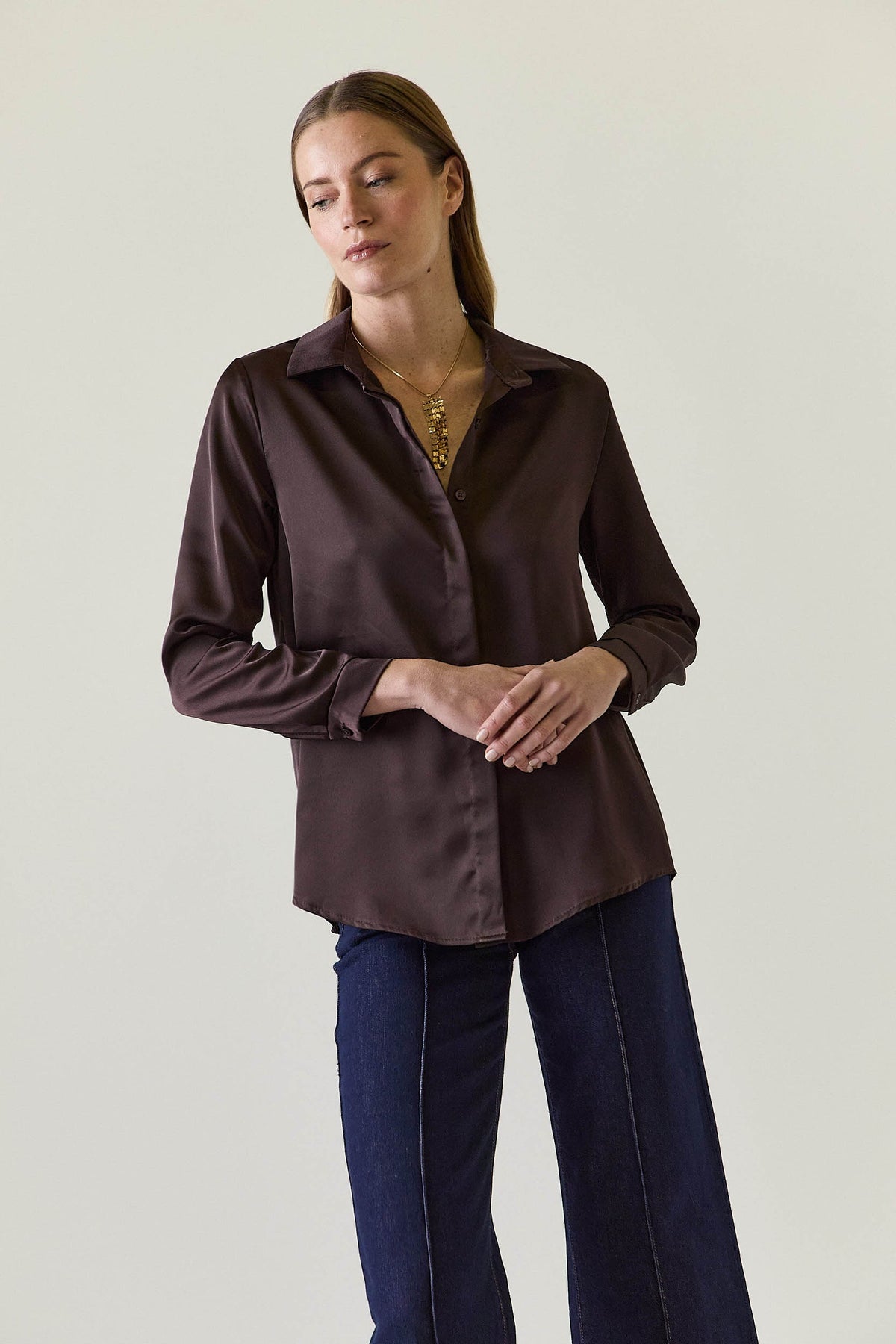 Camisa de satén en color marrón con acabado fluido y tacto suave. Presenta un diseño limpio y atemporal, con cuello camisero clásico y cierre frontal de botones al tono. Su caída ligera aporta movimiento al conjunto y permite llevarla tanto por dentro como por fuera del pantalón. Un fondo de armario versátil que encaja en looks de diario o más arreglados.